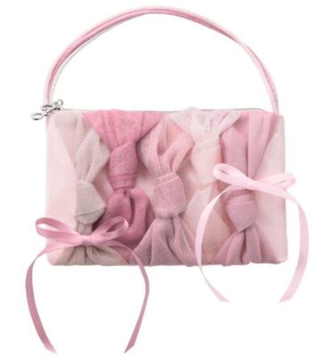 ピンクのリボンをあしらった、まるでクチュールドレスなクラッチバッグ風ポーチ。