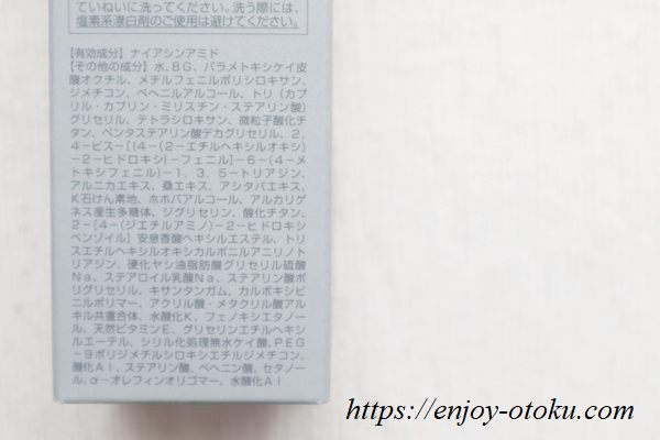 その他の成分:水、BG、パラメトキシケイ皮酸オクチル、メチルフェニルポリシロキサン、ジメチコン、ベヘニルアルコール、トリ(カプリル・カプリン・ミリスチン・ステアリン酸)グリセリル、テトラシロキサン、微粒子酸化チタン、ベンタステアリン酸デカグリセリル、2,4-ビス-[{4-(2-エチルヘキシルオキシ)-2-ヒドロキシ}-フェニル]-6-(4-メトキシフェニル)-1,3,5-トリアジン、アルニカエキス、桑エキス、アシタバエキス、K石けん素地、ホホバアルコール、アルカリゲネス産生多糖体、ジグリセリン、酸化チタン、2-[4-(ジエチルアミノ)-2-ヒドロキシベンゾイル]安息香酸ヘキシルエステル、トリスエチルヘキシルオキシカルボニルアニリノトリアジン、硬化ヤシ油脂肪酸グリセリル硫酸Na、ステアロイル乳酸Na、ステアリン酸ポリグリセリル、キサンタンガム、カルボキシビニルポリマー、アクリル酸・メタクリル酸アルキル共重合体、水酸化K、フェノキシエタノール、天然ビタミンE、グリセリンエチルヘキシルエーテル、シリル化処理無水ケイ酸、PEG-9ポリジメチルシロキシエチルジメチコン、酸化Al、ステアリン酸、ベヘニン酸、セタノール、α-オレフィンオリゴマー、水酸化Al