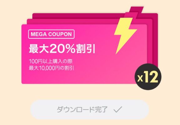 「一括ゲット」から「ダウンロード完了✓」に表示が変われば、メガ割クーポンのゲット完了です。