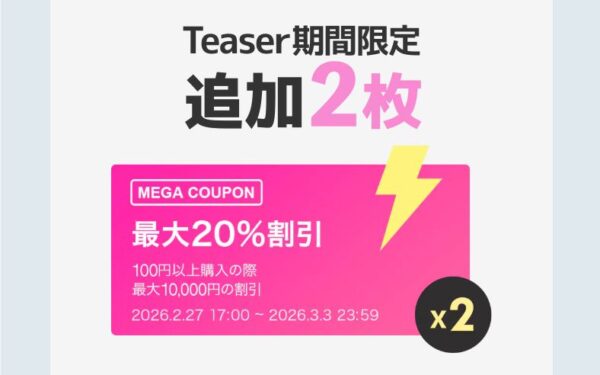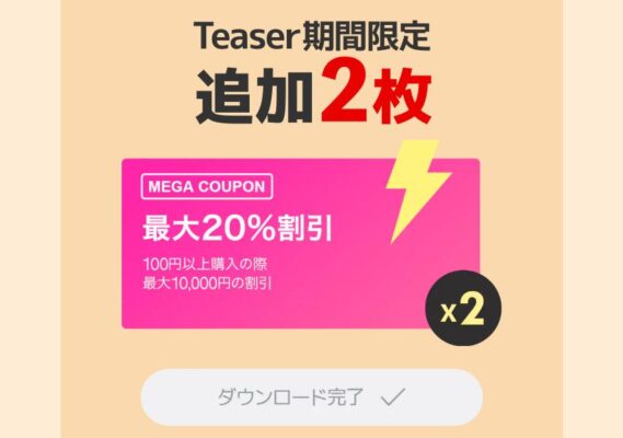 さらに、Teaser期間限定クーポンが2枚追加発行されているので忘れず取得しておきましょう。