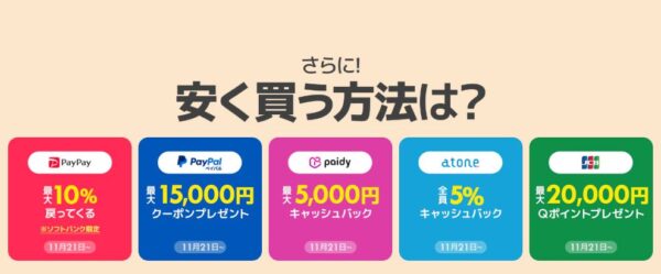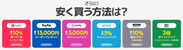 PayPalやPayPayなど、対象の決済方法で買い物をするとポイント還元やキャッシュバックがあるので更にお得に。