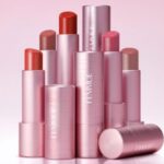 マーブル模様が美しいケアリップから、ピンクの偏光グリッターがさりげなくきらめくダスティピンク、ゴールドグリッターを配合した桜の花びらのように華やかなピンクレッドが登場。